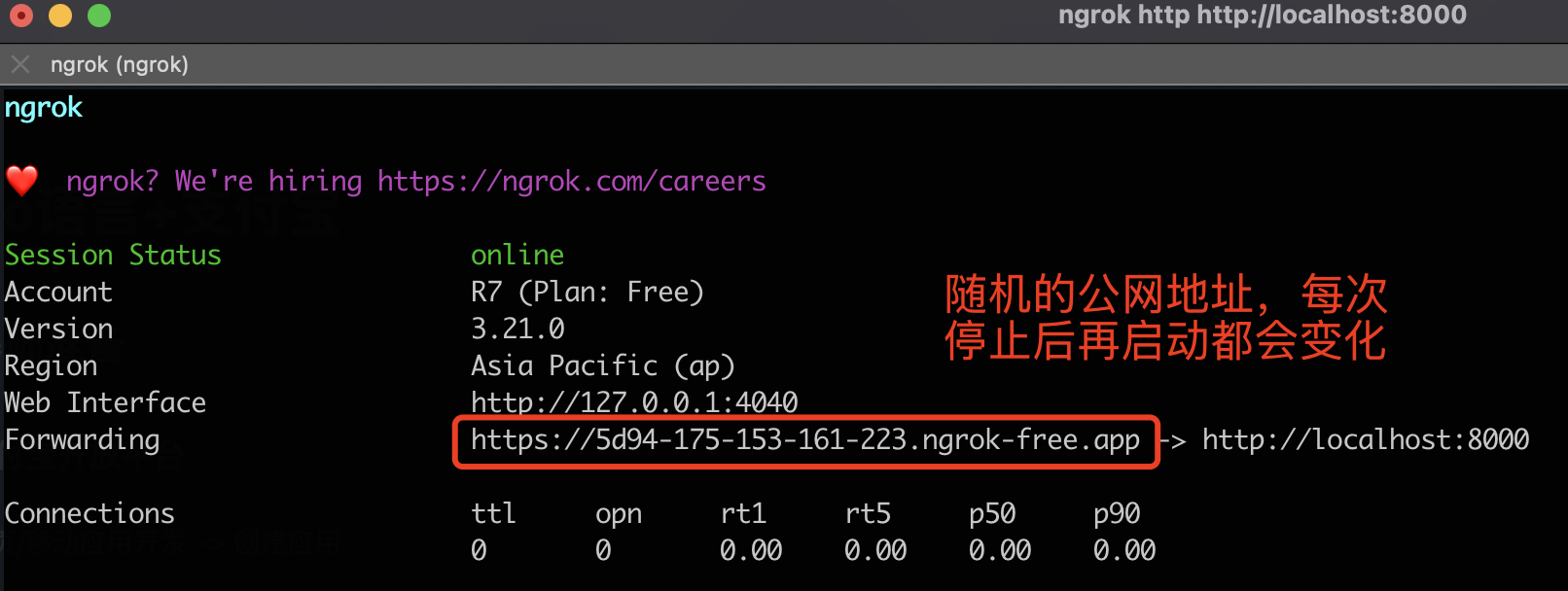 执行命令:ngrok http http://localhost:8000