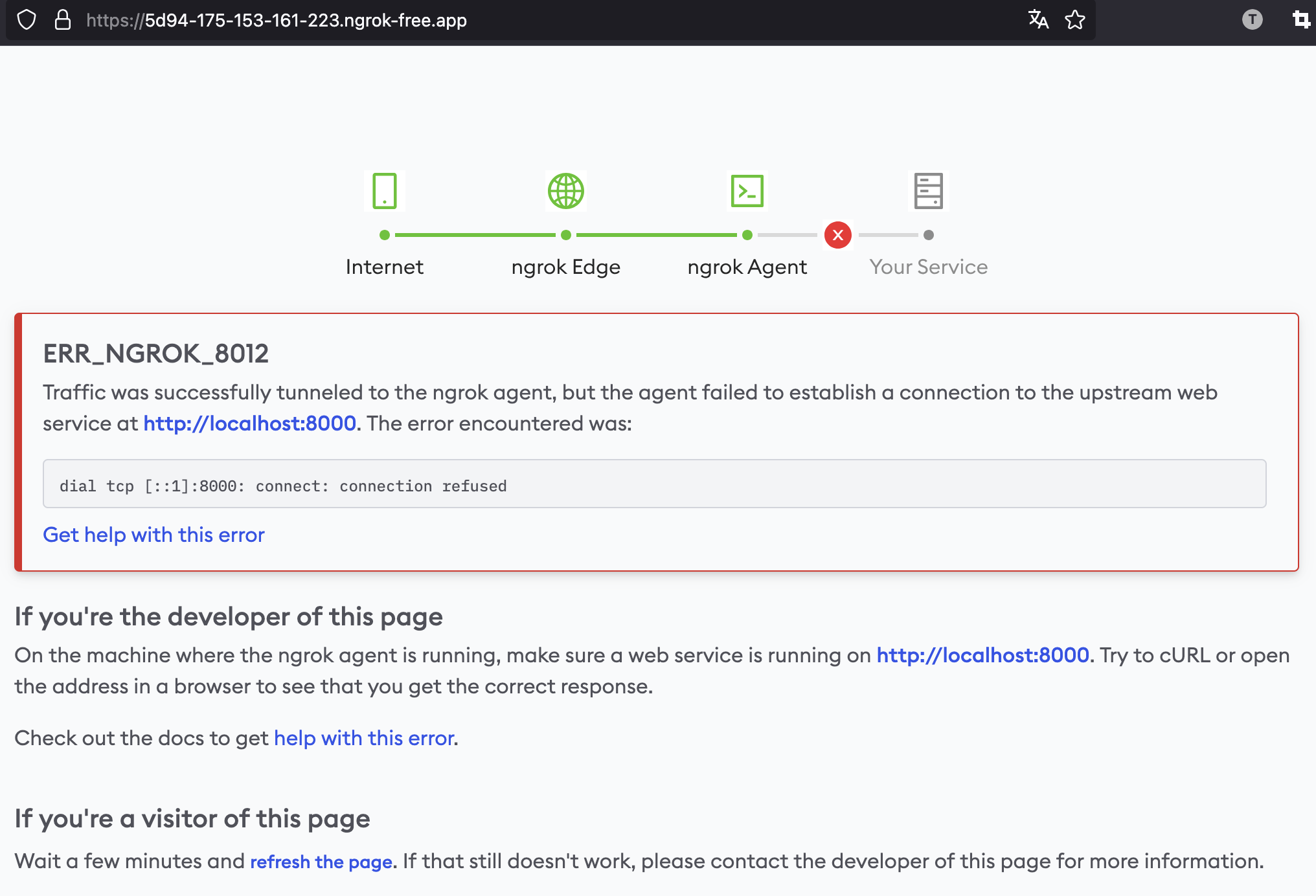 如果此时你停掉本地服务,再访问这个随机地址,会看到ngrok的报错页面。